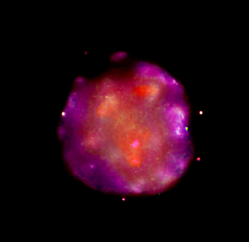 Born after a violent explosion of a star, this cosmic gourd is the supernova remnant G272.2-03.2. X-ray observations (orange and magenta) from Chandra provide evidence that G272 is the result of a Type Ia supernova explosion, where a white dwarf star pulls material from a companion star until it triggers a thermonuclear explosion and obliterates the star. The inside of the “pumpkin” is superheated gas that is filling the space cleared out by the explosion as it moves outward.