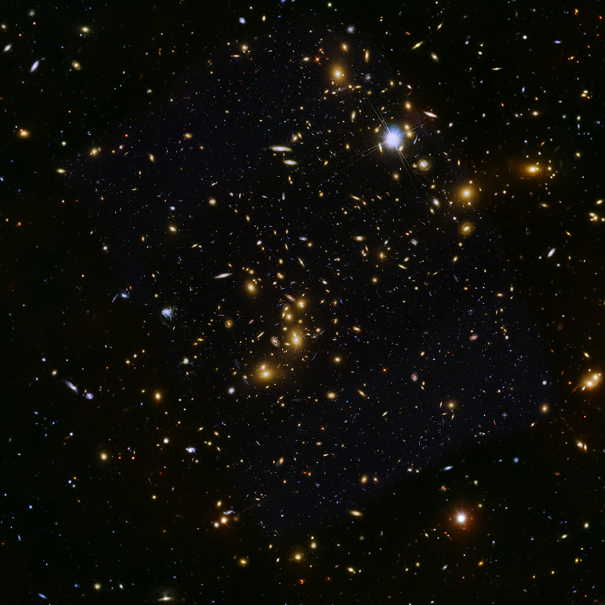 Galaxy clusters are the largest objects in the universe held together by gravity. They contain enormous amounts of superheated gas, with temperatures of tens of millions of degrees, which glows brightly in X-rays, and can be observed across millions of light years between the galaxies. This image of the Abell 2744 galaxy cluster combines X-rays from Chandra (diffuse blue emission) with optical light data from Hubble (red, green, and blue).