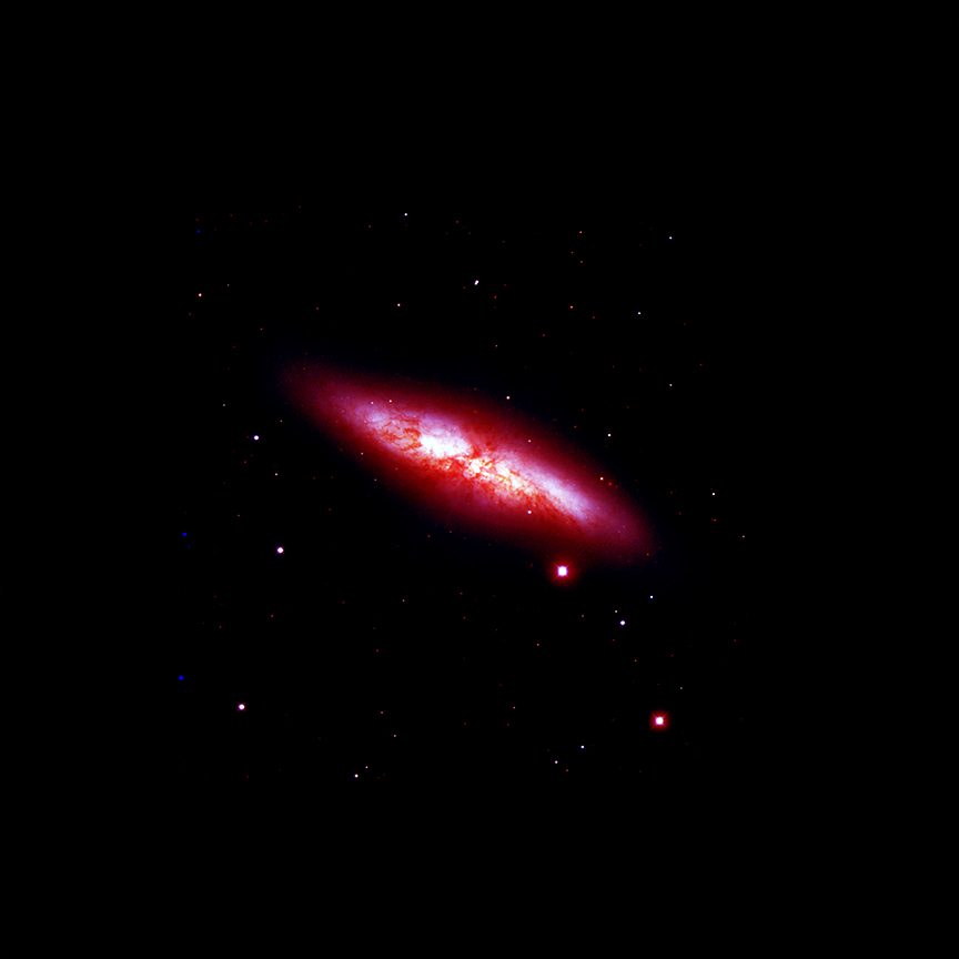 Messier 82, or M82, is a galaxy that is oriented edge-on to Earth. This gives astronomers and their telescopes an interesting view of what happens as this galaxy undergoes bursts of star formation. X-rays from Chandra (appearing as blue and pink) show gas in outflows about 20,000 light years long that has been heated to temperatures above ten million degrees by repeated supernova explosions. Optical light data from NASA's Hubble Space Telescope (red and orange) shows the galaxy.