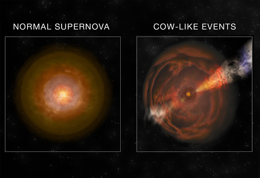 Artist's Illustration: A normal supernova compared to a Cow-like supernova.
